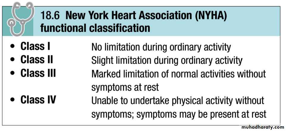 The New York Heart Association (NYHA) functional classification is used to grade disability: