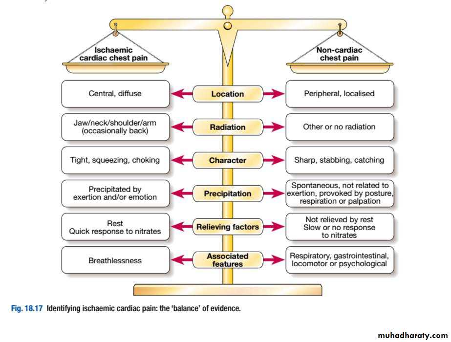 Several key characteristics help to distinguish cardiac pain from that of other causes.Diagnosis may be difficult and it is helpful to classify pain as possible, probable or definite ischaemic cardiac pain, based on the balance of evidence, as in this figure: