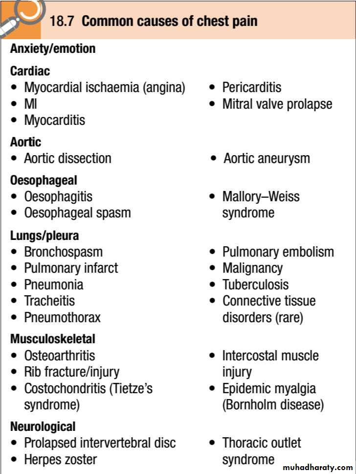 Chest pain is a common presentation of cardiac disease but can also be a manifestation of anxiety or disease of the lungs or musculoskeletal or gastrointestinal systems.Some patients deny ‘pain’ in favour of ‘discomfort’ but the significance remains the same.