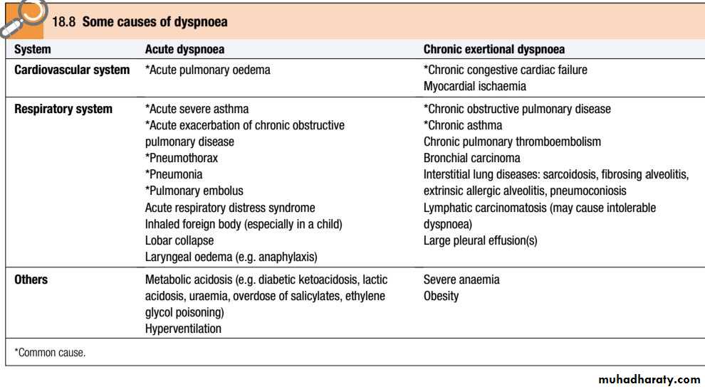Dyspnoea of cardiac origin may vary in severity from an uncomfortable awareness of breathing to a frightening sensation of ‘fighting for breath’.The sensation of dyspnoea originates in the cerebral cortex.