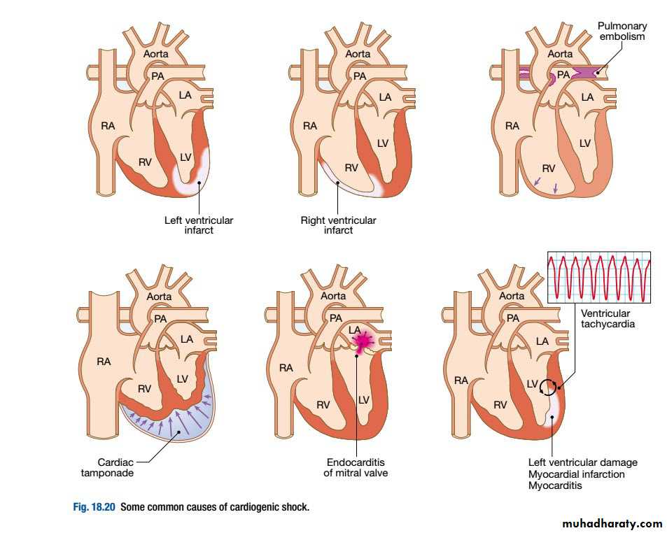Shock in acute MI is due to left ventricular dysfunction in more than 70% of cases.However, it may also be due to infarction of the RV and a variety of mechanical complications, including tamponade (due to infarction and rupture of the free wall), an acquired ventricular septal defect (due to infarction and rupture of the septum) and acute mitral regurgitation (due to infarction or rupture of the papillary muscles).