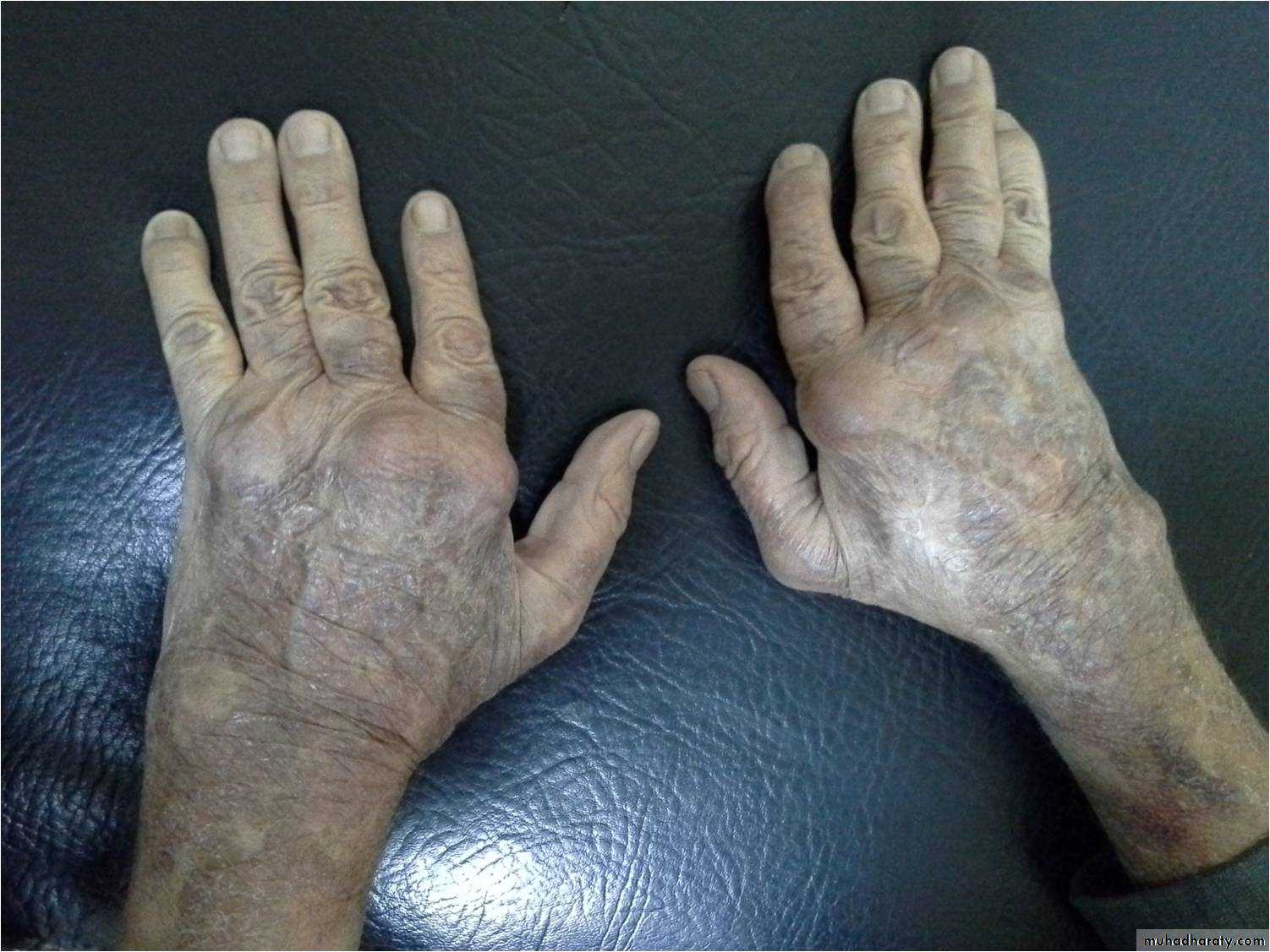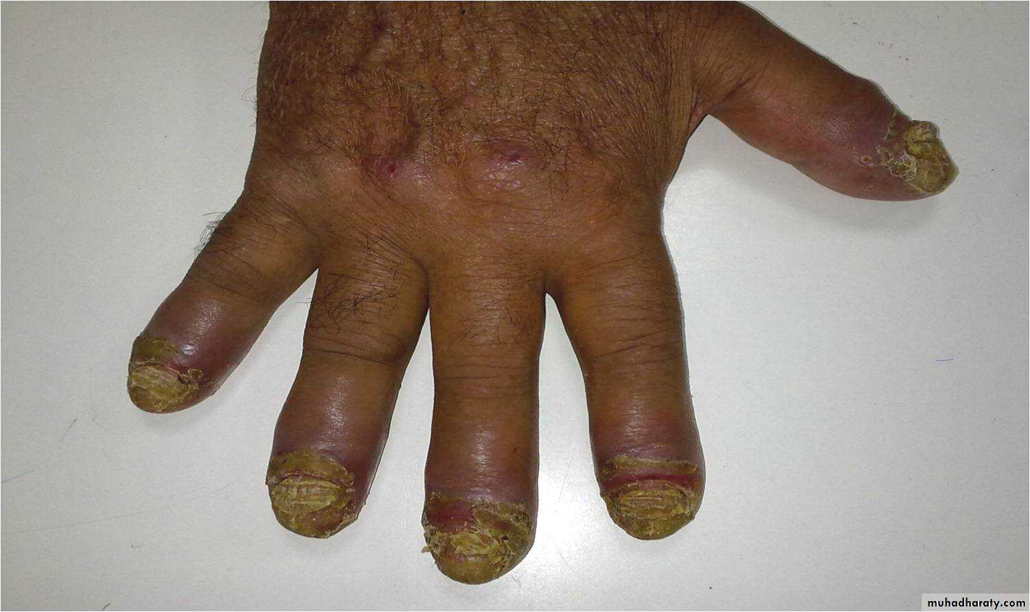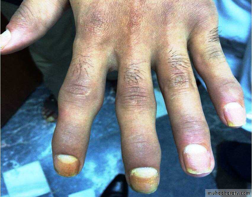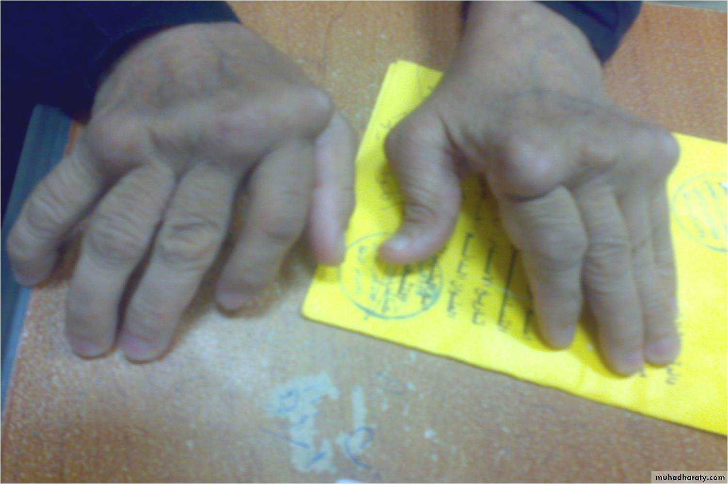 targeting the fingers and toes that Prominent cartilage and bone destruction results in marked instability.The encasing skin appears invaginated and ‘telescoped’ (‘main en lorgnette’) and the finger can be pulled back to its original length
