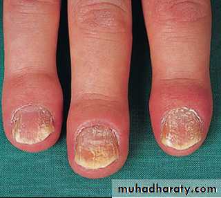 pitting, onycholysis, subungual hyperkeratosis and horizontal ridging.They are found in 85% of those with PsA and only 30% of those with uncomplicated psoriasis, and can occur in the absence of skin disease.