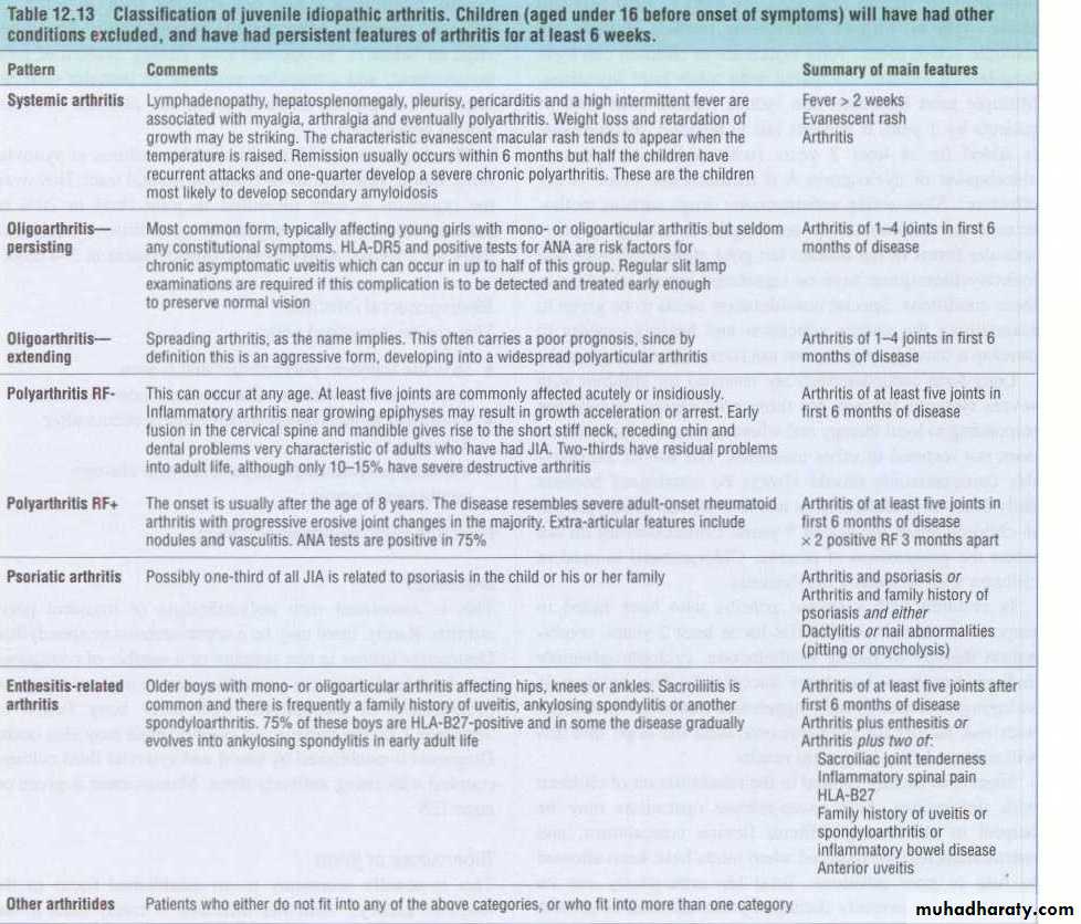 Inflammatoty arthritis in children is much less common than in adult . there is no specific test which definitely prove the diagnosis.Etiology is unknown.The most recent classification is the international league rheumatism(ILAR)