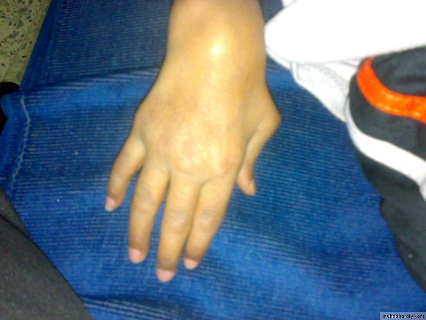 This occurs most characteristically in the hands and feet, when synovitis of a finger or toeis coupled with tenosynovitis, enthesitis and inflammation of intervening tissue to give a‘sausage digit’ or dactylitis .