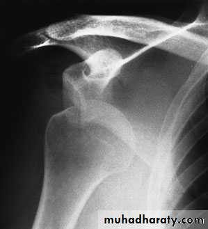 The anteroposterior x-ray will show the overlapping shadows of the humeral head and glenoid fossa, with the head usually lying below and medial to the socket.A lateral view aimed along the blade of the scapula will show the humeral head out of line with the socket.