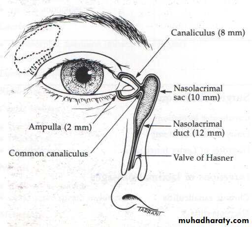 e- The nasolacrimal duct: 12mm, ends into valve of Hasner.