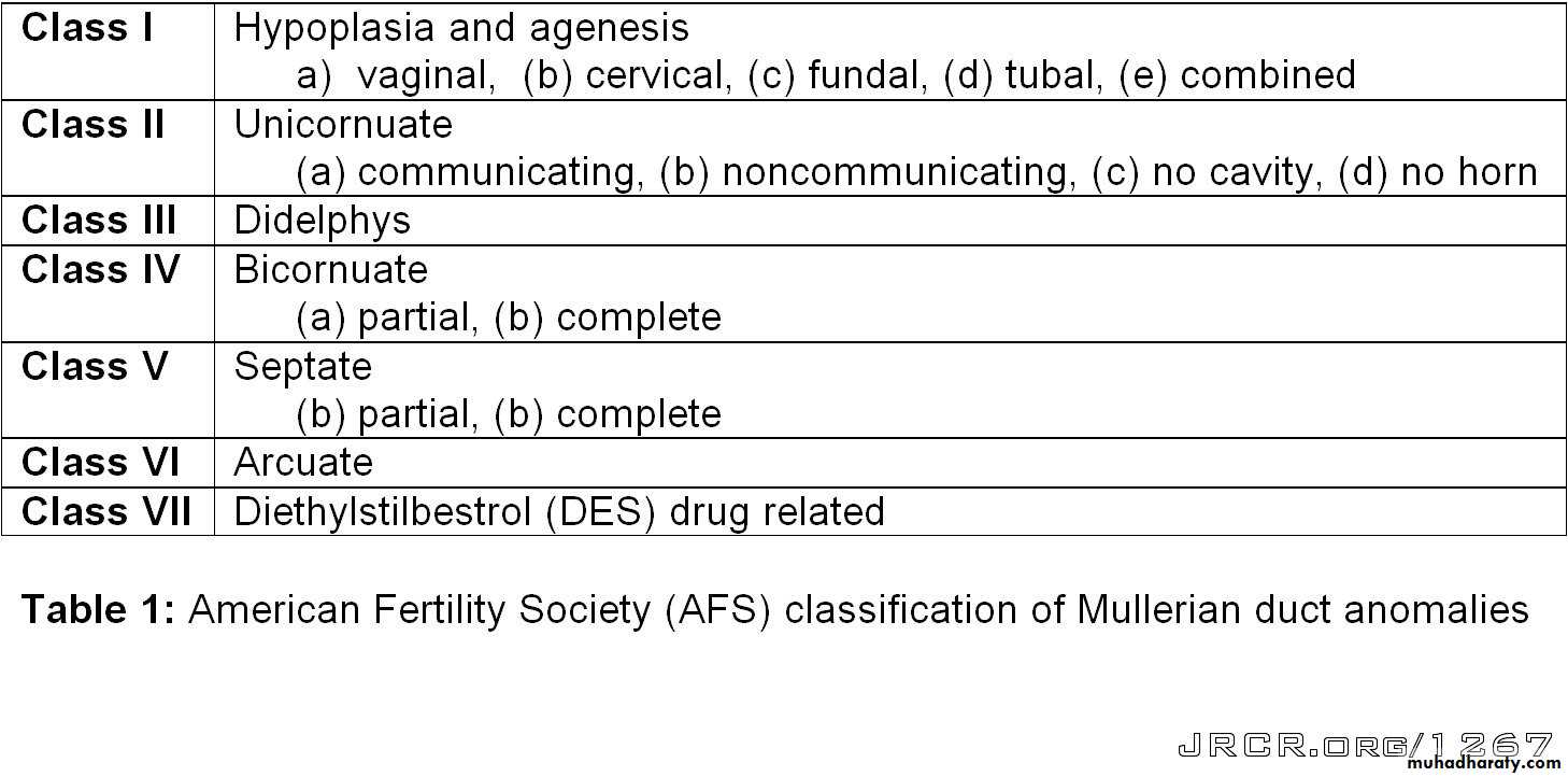 The most widely accepted method of categorizing müllerian duct anomalies is the AFS classification (1988). This system organizes müllerian anomalies according to the major uterine anatomic defect. It also allows for standardized reporting methods.I -Segmental or complete agenesis or hypoplasia