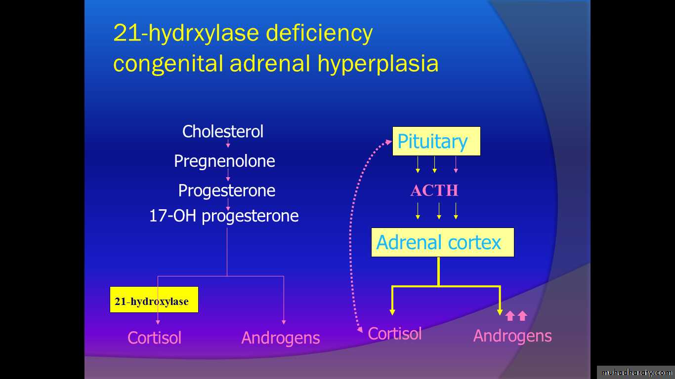 The term congenital adrenal hyperplasia (CAH) describes several autosomal recessive disorders that result from complete or partial deficiency of an enzyme involved in cortisol and aldosterone synthesis, usually 21-hydroxylase or less frequently 11-hydroxylase.