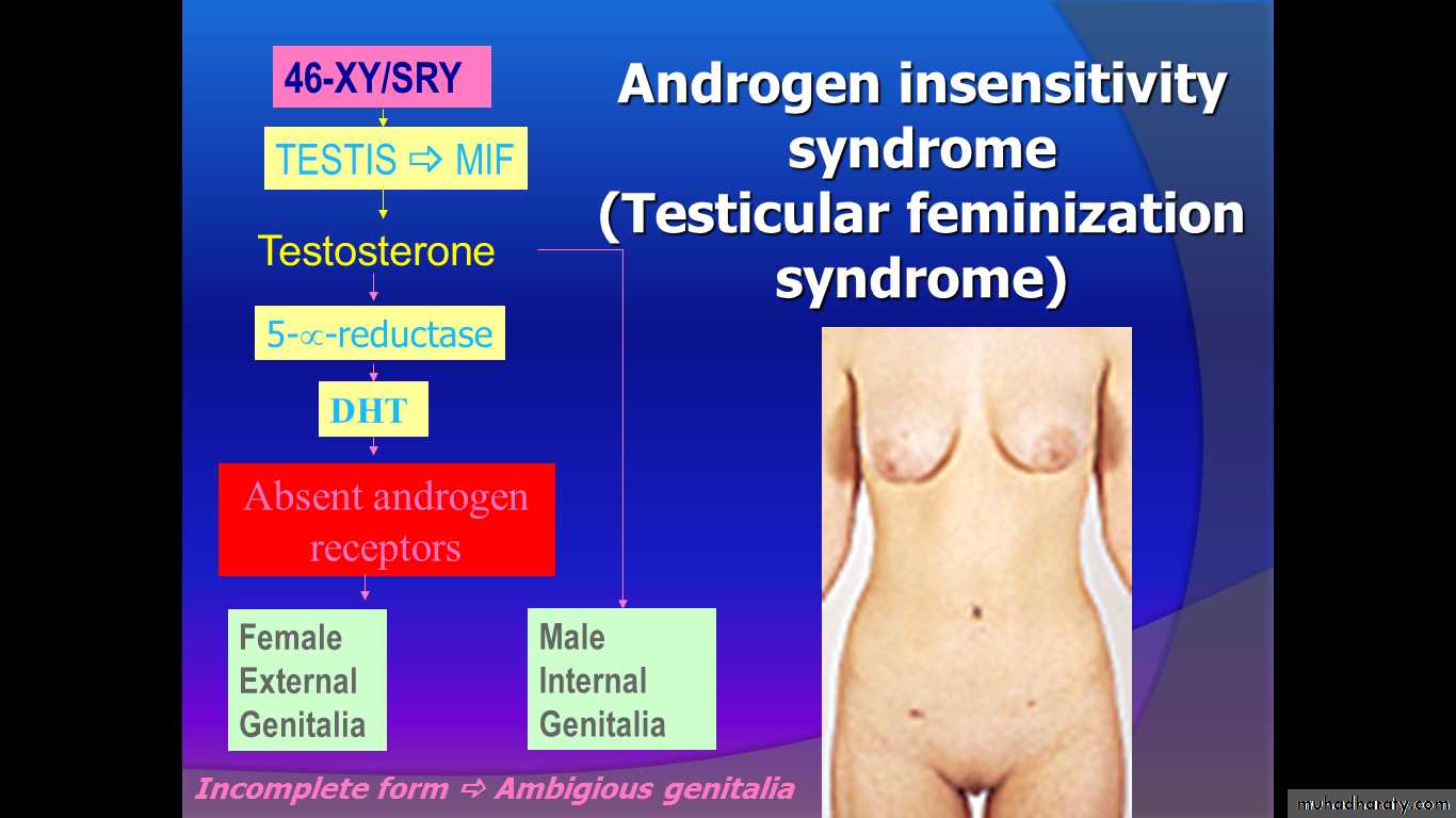 is incomplete so there is external genital ambiguity of various degree ,the uterus ,upper vagina are absent because of production of the MIF by the testes is normal .