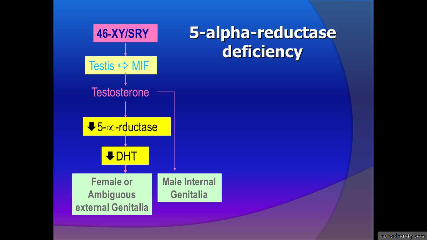 This enzyme deficiency is autosomal recessive so family history of such cases may be present. It affect the conversion of testosterone to DHT required for masculinization of the ext. genetalia in the male (poor musculinization so placed in female role) ,there is normal production of MIF so always there is absence of the uterus and vagina.#Clinical features: