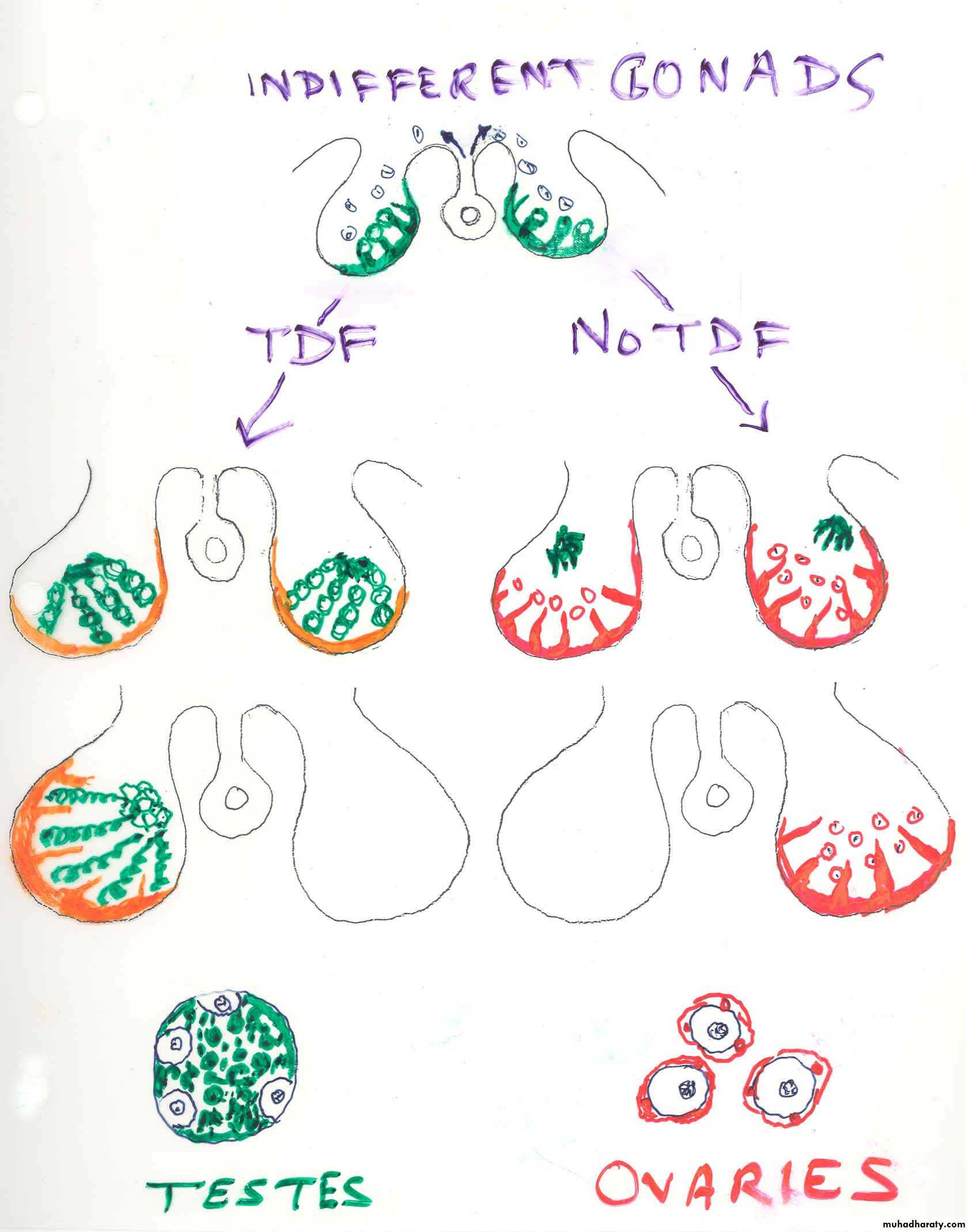 The differentiation of the gonads into testis depends on the presence of sex determining region or gene (SRY) located on the short arm of the Y chromosome. Deletion of this SRY gene results in XY female.Ovarian Differentiation