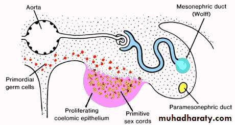 Gonads:The phase of indifferent gonads (Genital Ridge): -The gonads do not acquire male or female morphological features until the 7th week of development.