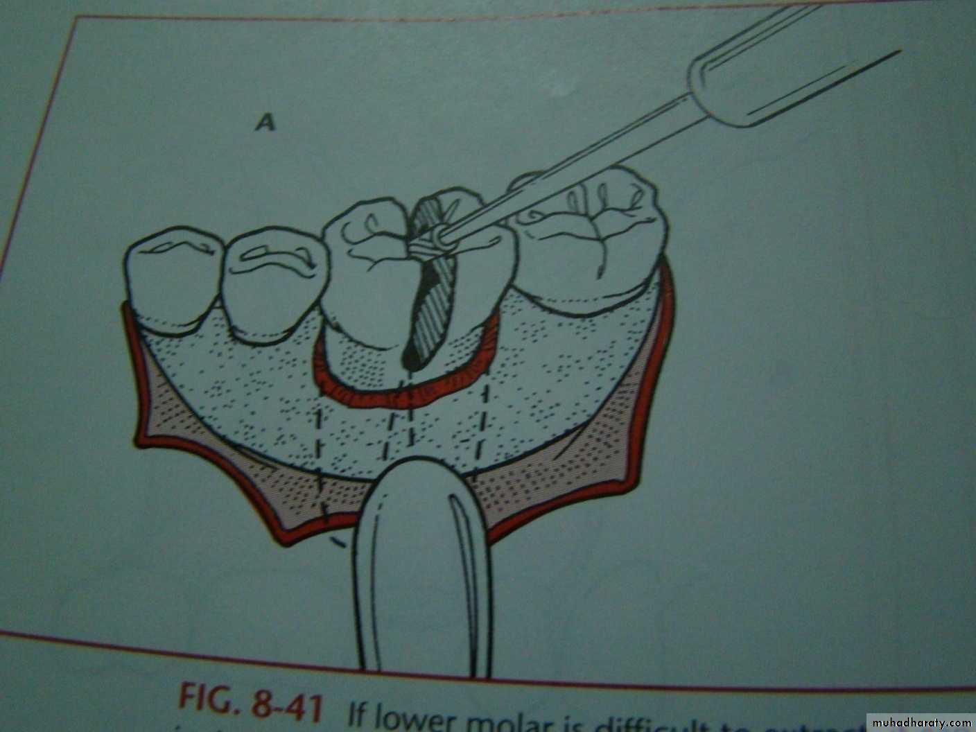 1- decapitation : division of the crown of the tooth at cervical margin level. It is indicated in horizontally impacted mandibular 3rd molar .2 – longitudinal tooth division : indicated when the impacted tooth has a widely divergent straight roots or when one root is straight and the other is curved( different path of removal )