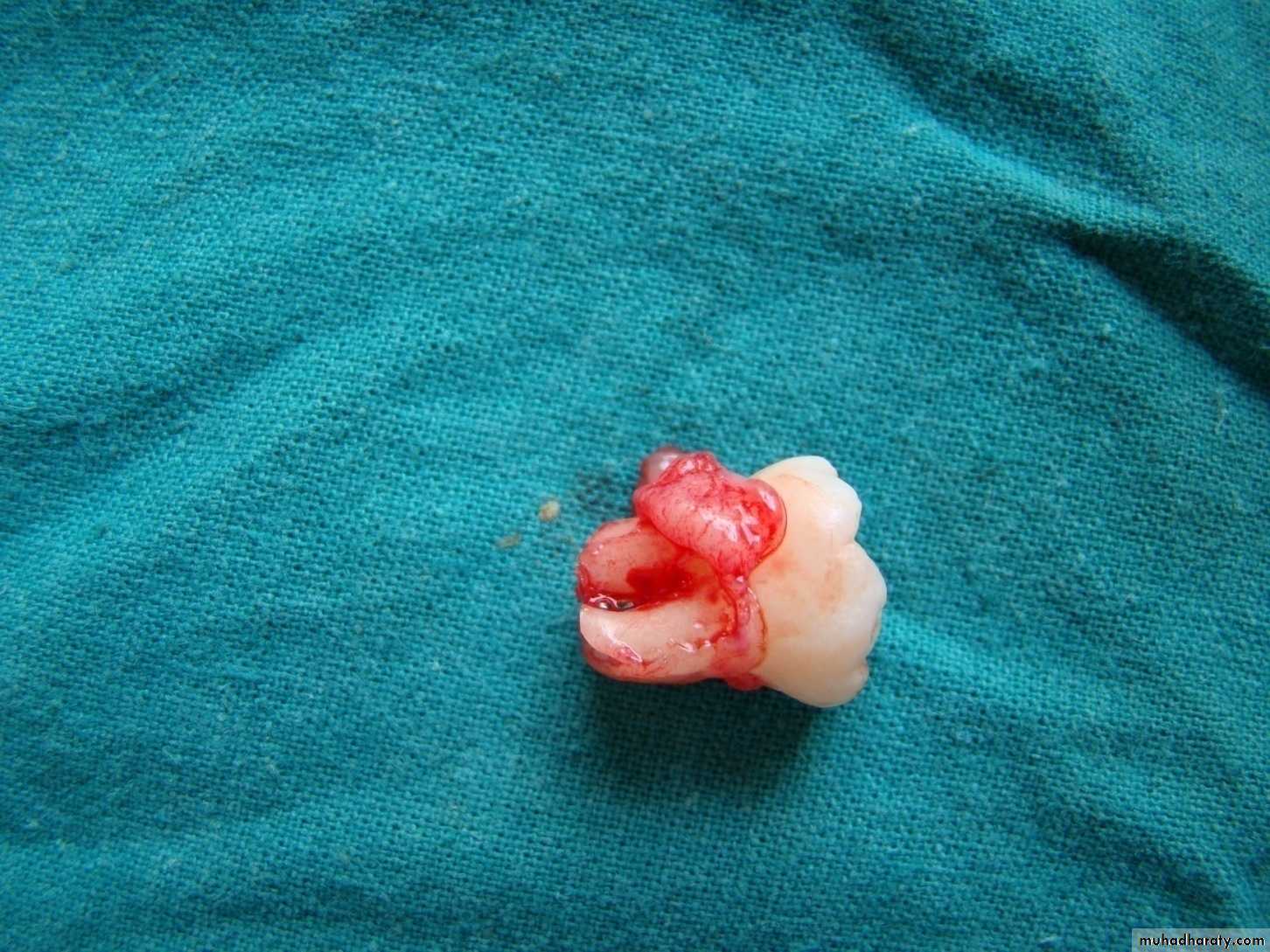After removal of the tooth from its socket the wound is gently irrigated with sterile normal saline solution and inspected for :1- Any remnant of the residual tooth sac ( tooth follicle) is removed .