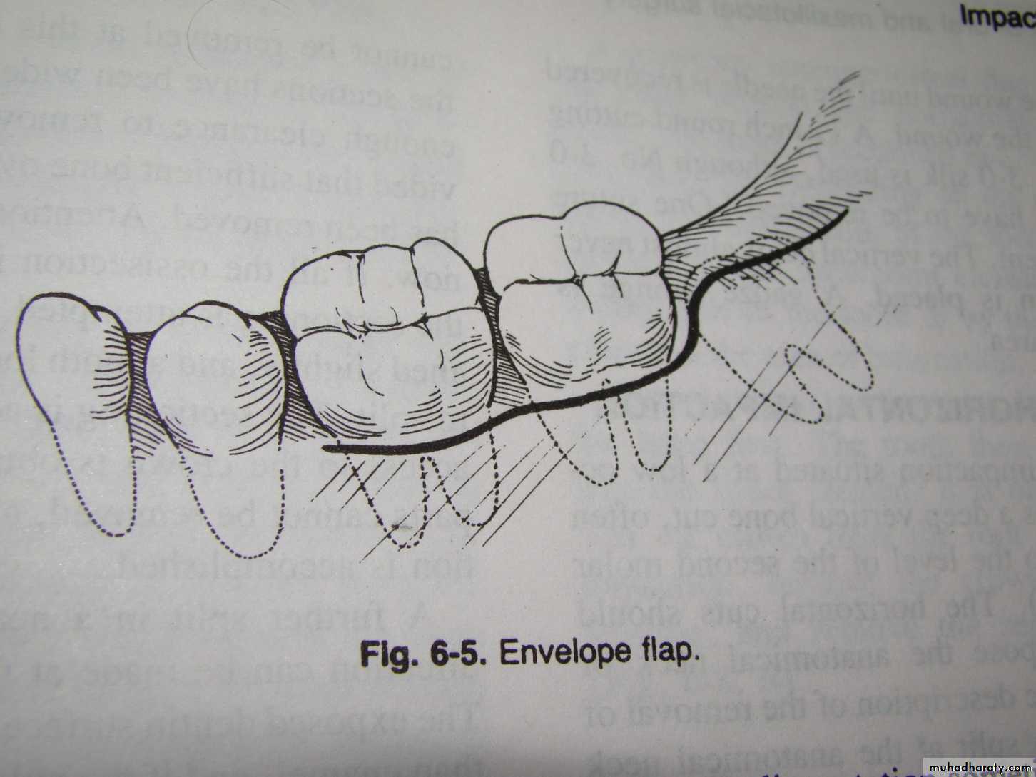 There are 3 types of mucoperiosteal flap design for removal of impacted lower third molar :1- envelop flap : used for soft tissue impaction that need no bone removal. No vertical incision