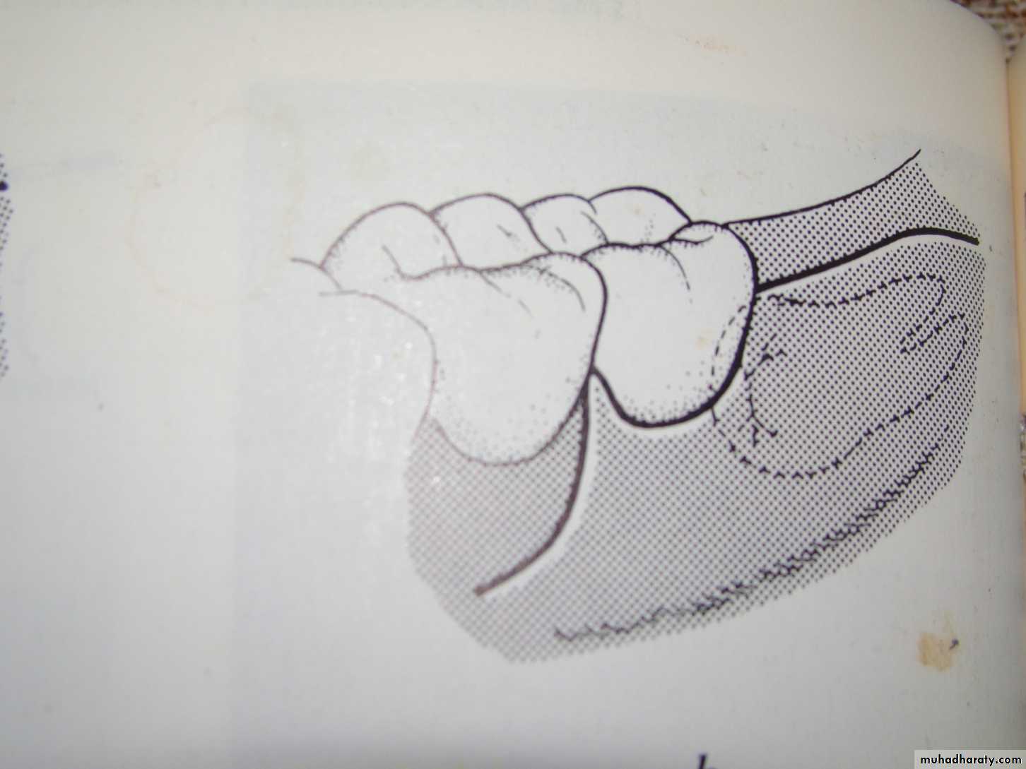 2- standard flap indicated in all cases of impacted lower third molar . The vertical releasing incision lie distal to the second molar.