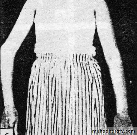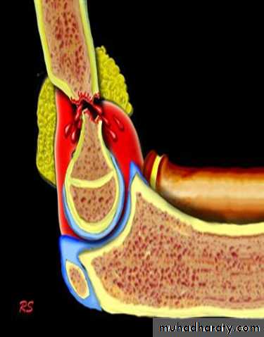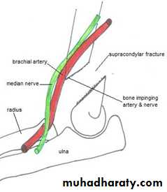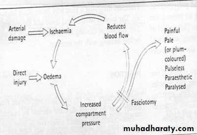 The ischemia also occur in the forearm due to edema in the muscles in close facial space this called( compartment syndrome) , and this will end after 12 hours or less in necrosis of nerves and muscles within the compartment .