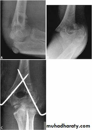 Minor displacement less than 5 mm. need only back slab in elbow flexed , after 7 days do full p.o.p. for 2-3 weeks .If the piece is trapped into the joint , then it must be freed either by manipulation under anesthesia , if failed or the piece is severely displaced then we should do open reduction and fixation by K wire or screw .