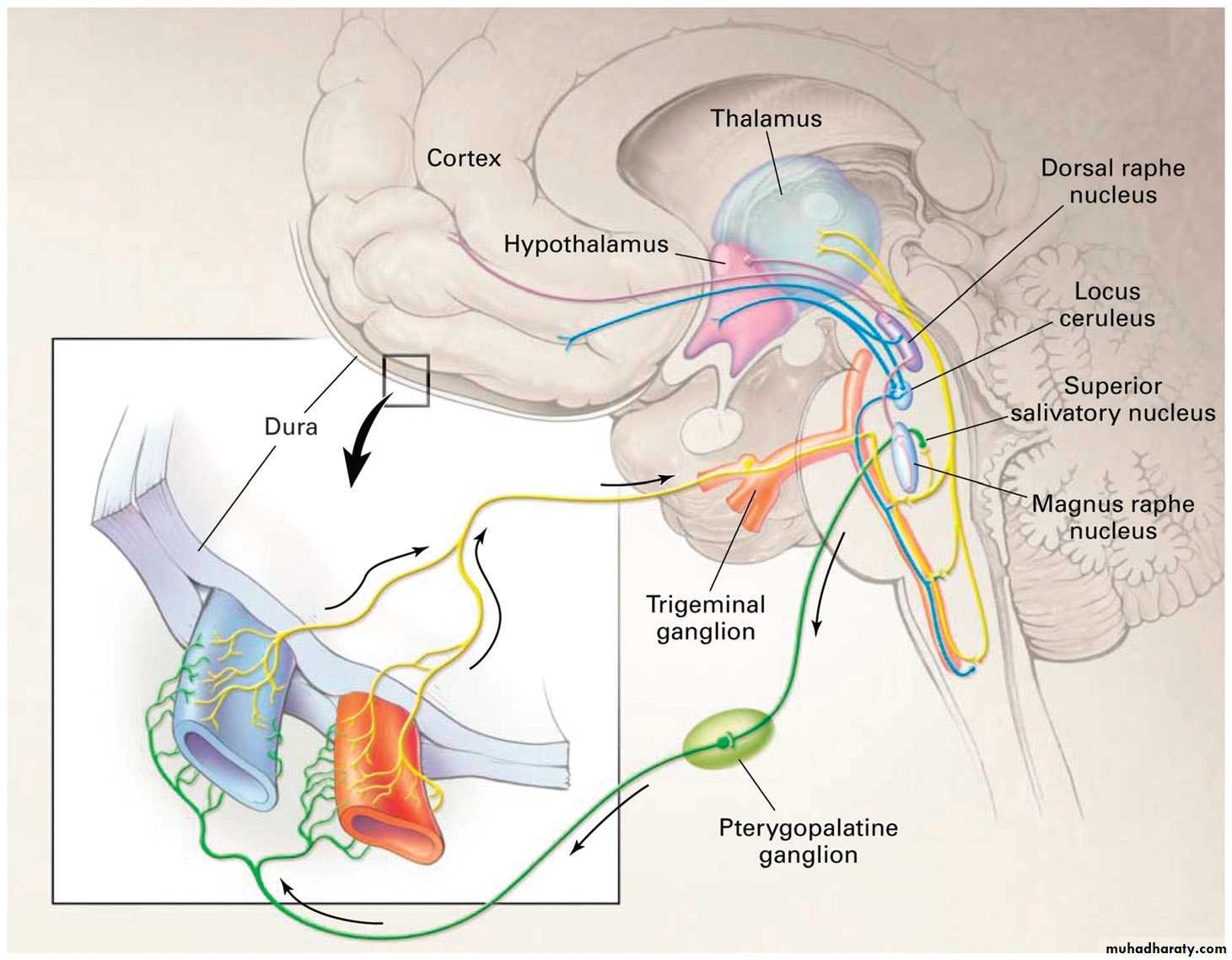 evidence that the aura is due to dysfunction of ion channels causing a spreading front of cortical depolarisation (excitation) followed by hyperpolarisation (depression of activity). This process (the ‘spreading depression’) spreads over the cortex at a rate of about 3 mm/minute, corresponding to the aura’s symptomatic spread. The headache phase is associated with vasodilatation of extracranial vessels. Activation of the trigeminovascular system is probably important.• Genetics of Migraine