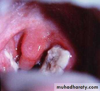 The tonsils are enlarged red and swollen. The crypts become filled with pus producing the follicular appearance (follicular tonsillitis). These follicles may coalesce forming a patchy membrane on the surface of the tonsil (membranous tonsillitis).