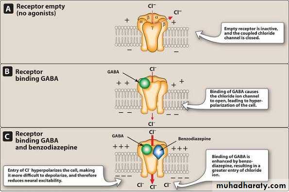 • Binding of GABA (the major inhibitory neurotransmitter in the central nervous system) to its receptor triggers an opening of a chloride channel, which leads to an increase in chloride conductance• Benzodiazepines increase the frequency of channel openings produced by GABA. The influx of chloride ions causes hyperpolarization of the cell making it more difficult to depolarize and there for reduces neural excitability