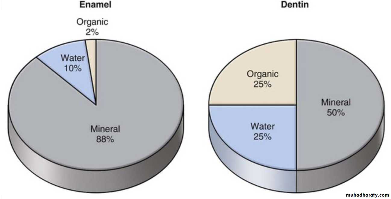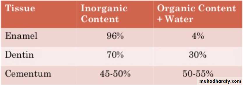 The Inorganic content of mature enamel amounts to 96% by weight; the remainder is organic material (protein, lipid) and water.On the basis of volume around 88% is mineral,10% is water, and 2% is organic material (protein, lipid).