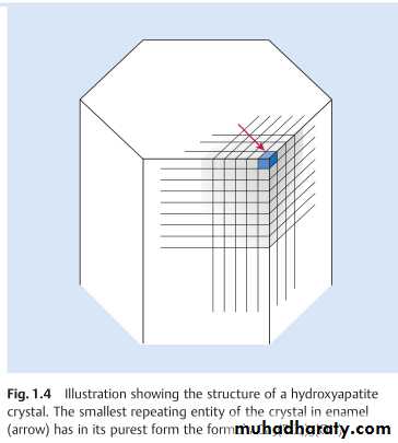 The smallest repeating entity of the crystals in enamel has in its purest form, the formula Ca5(PO4)3(OH) , which is termed hydroxyapatite (HAP).The crystals are approximately hexagonal in cross-section, with a diameter 40nm.