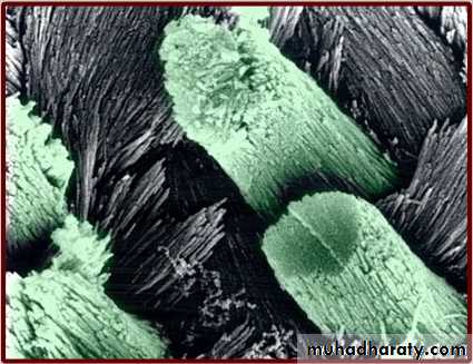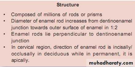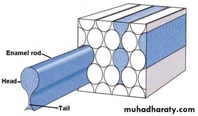 The individual crystals are arranged in rods (or prisms) extending from the enamel–dentin junction to the surface, with an average diameter of about 4–5µm.Each rod formed of about 300 unit crystal length and 40 units wide and 20 unit thick in three dimensional hexagon.