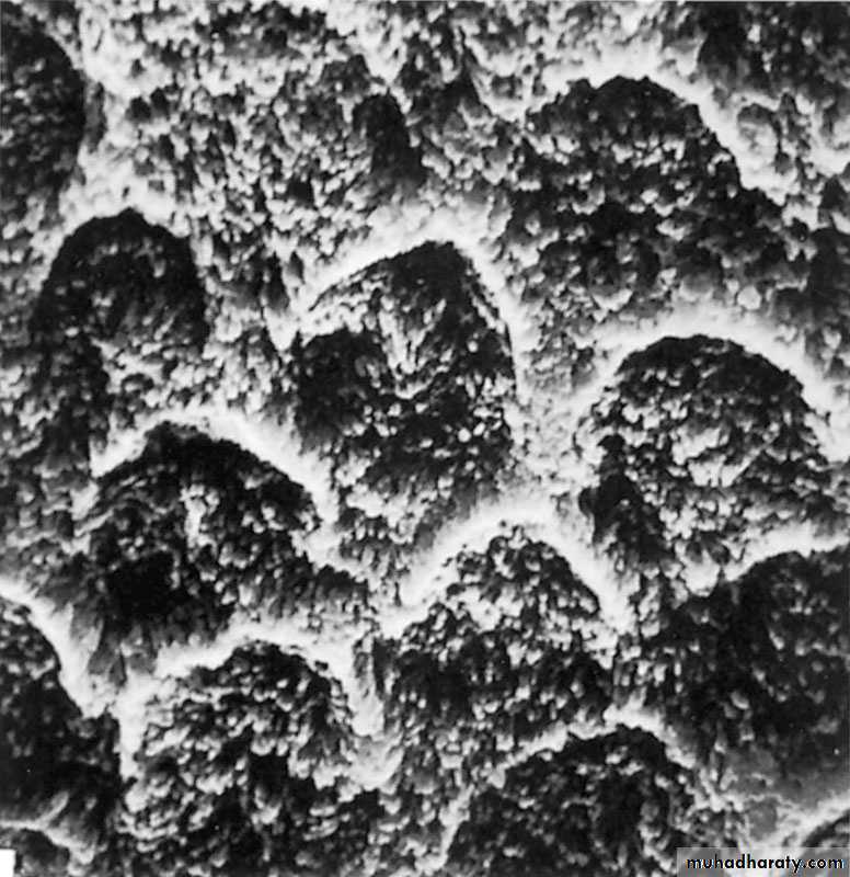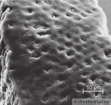 However, at high magnification the surface of enamel is full of developmental defects such as pits, cracks, and fissures as well as normal anatomical features such as Tomes’ process pits corresponding to the head of the ameloblasts.
