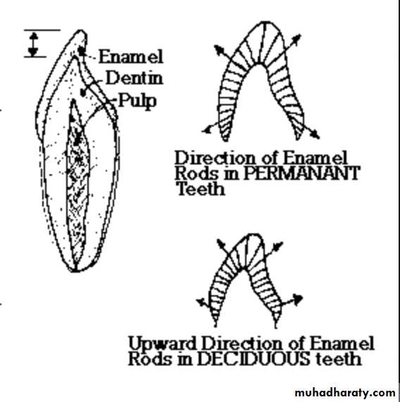 Towards the incisal edge these become increasingly oblique and are almost vertical at the cusp tips.Enamel is soluble when exposed to an acid medium, but the dissolution is not uniform.
