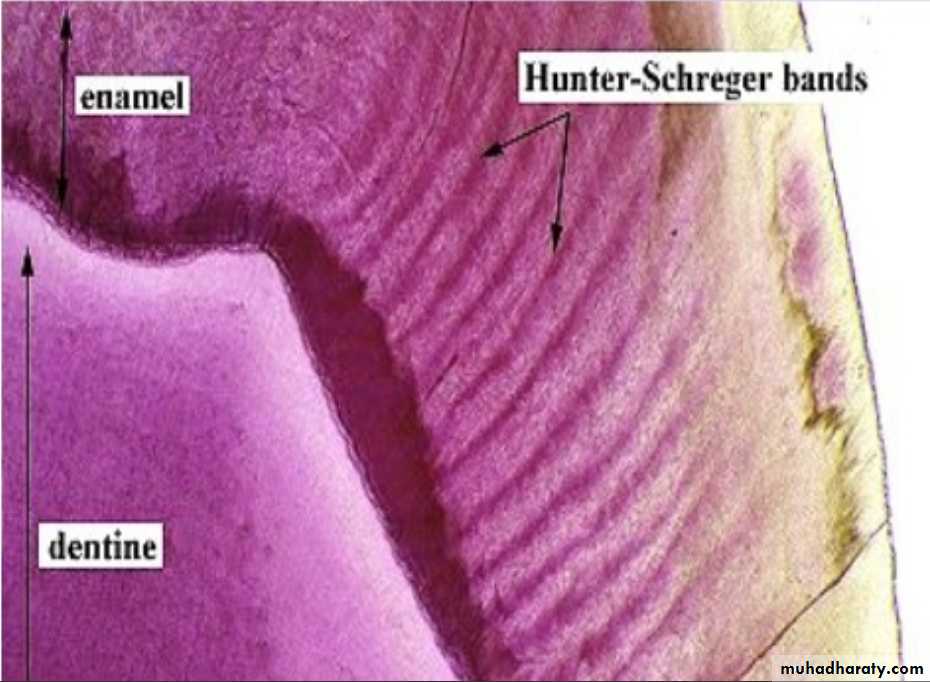 Hunter-Schreger bands usually occur because of alteration of light reflection(Optical phenomenon) ,due to changes in rod direction.This results in alternating light and dark zones under the microscope.