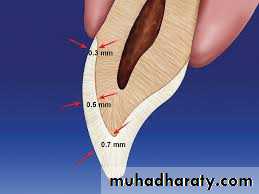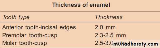 The thickness of enamel varies in different areas of the same tooth and from one type of tooth to another type of tooth.The average thickness of enamel at the incisal edges of incisors is 2 mm; at the cusp of premolar and molar from 2.3 to 3.0 mm.