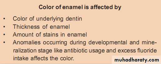 Well mineralized, permanent enamel is translucent, and it is the underlying dentin which, eventually, gives the tooth its color.