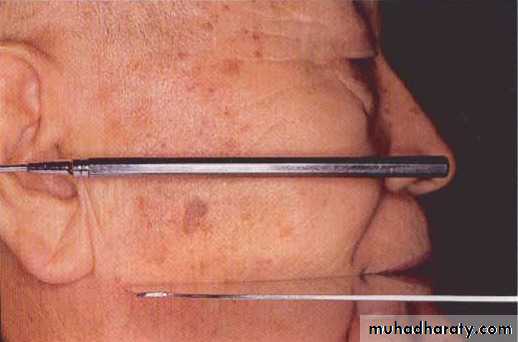 Measurement of a fixed landmark of the face by a special scale called the sorenson profile scale. The Sorenson Profile Scale measurement was taken by placing the nasion locator of the instrument firmly in the depression at the bridge of the nose and raising the chin seat until it lightly touched the most inferior and anterior border of the chin. Or by using Willis bite gauge which is designed to measure the distance from the pupil of the eye to the rima oris and the distance from the nasal spine to lower border of the mandible when measurement is equal the jaw at rest.