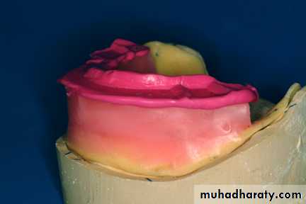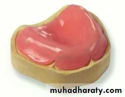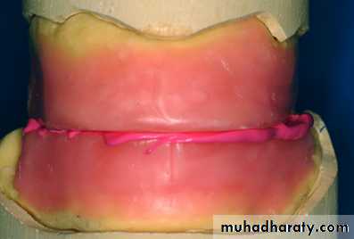 • The records are made using a recording medium (impression plaster, zinc oxide eugenol, impression compound and wax) between the occlusion rims or the trial denture bases. The patient closes into the recording medium with the lower jaw in its most retruded position and stops the closure at a predetermined vertical relation.
