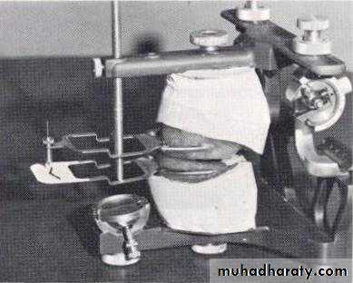 The purpose of these records is to adjust the articulator to simulate the eccentric movements (lateral and protrusive) of the mandible to the maxillae. This adjustment permit arrangement of the teeth in balanced occlusion. The records are made in the same manner as for centric records, for lateral movement record, Hanu recommend the following formula :