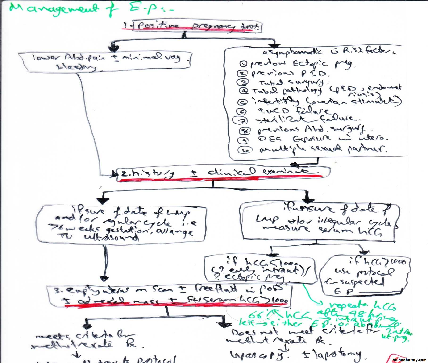 An intra-uterine gestational sac should be visualized at about 4,5weeks of gestation. The corresponding BHCG is around 1500mlIU/ml. At5weeks gestation, fetal cardiac pulsation corresponding to 3000mlIU/ml. Thus if there were discrepancy between BHCG concentration & that seen on ultrasound scan, the differential diagnosis of EP must be made. Identification of an intrauterine pregnancy on TVS effectively excludes the possibility of an EP except with rare heterotopic pregnancy. The presence of free fluid during TVS is suggestive of ruptured EP.Laparoscopy: can be used in diagnosis & treatment of EP.
