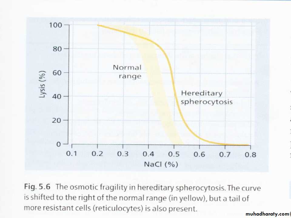*Suggested by a family history of HS and characteristic finding on PBS i.e.* spherocytes. Two studies are used to confirm the diagnosis.1. osmotic fragility test. A positive test shows lysis of the patients red cells at hypotonic saline solution compared to simple swelling in normal cells. 2. Autohemolysis test : Normal autohemolysis is about 1% while HS cells will display Hb release