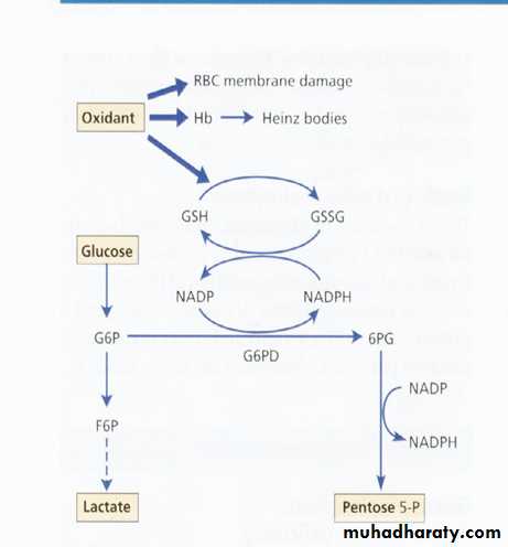 1. Glucose – 6- phosphate dehydrogenase (G6PD) deficiency : X-linked disorder.G6PD is important for generation of both NAD and NADH as well as glutathione, which is required for reduction or protection of sulfhydroxyl groups. Enzyme variants : Normal forms: Two forms of G6PD have normal activity, B form and A form or (A+) & (B+).