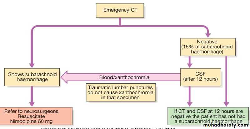 About 1 patient in 8 with a sudden severe headache has SAH and, in view of this, all patients with this presentation require investigation to exclude a subarachnoid hemorrhage.Subarachnoid hemorrhage typically presents with a sudden, severe 'thunderclap' headache (often occipital) which lasts for hours or even days, often accompanied by vomiting.