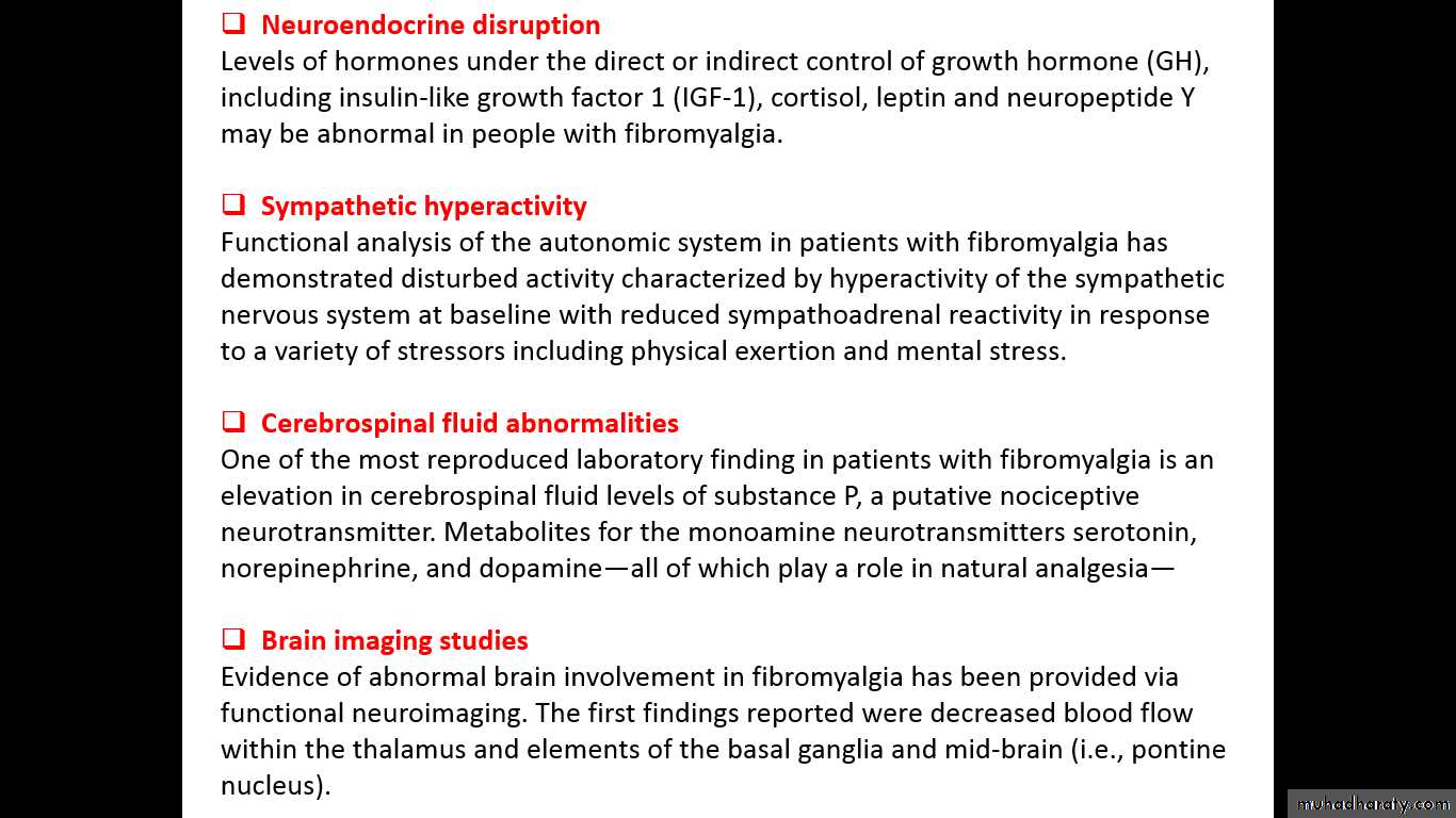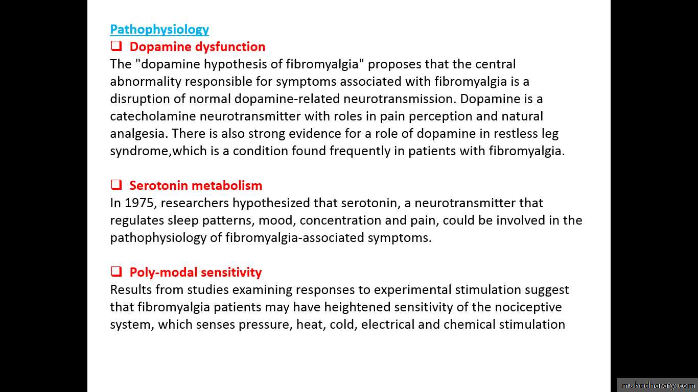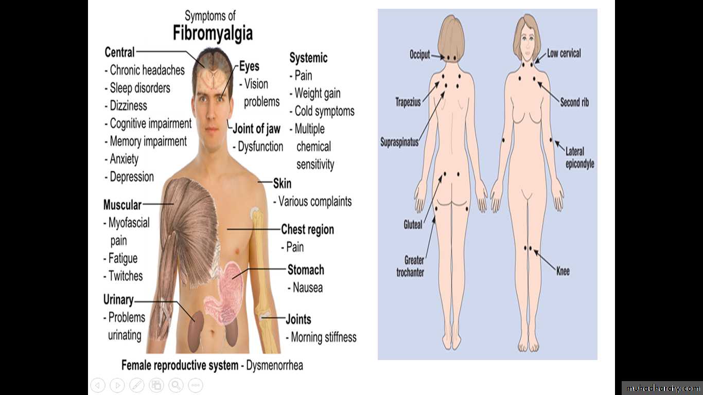 • 2-Abnormal pain processingA reduced threshold to pain perception and tolerance at characteristic sites throughout the body is a central feature of fibromyalgia