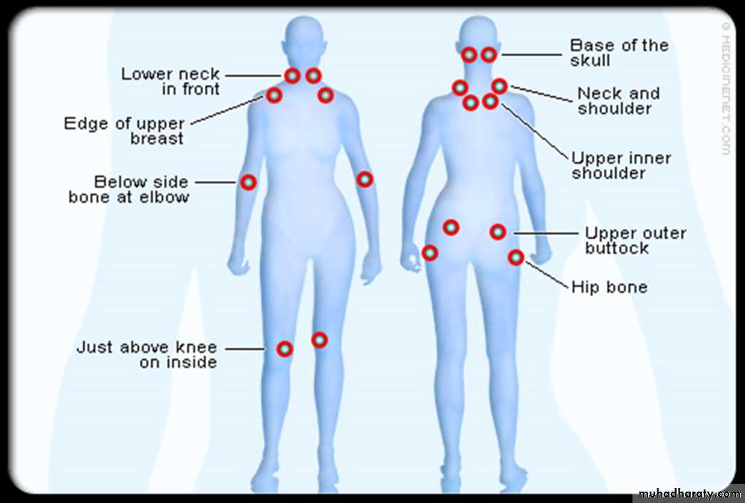 Widespread pain ,above and below the waist as well as the axial skeletal system ,for at least 3 months.The presence of 11/18 tender points .