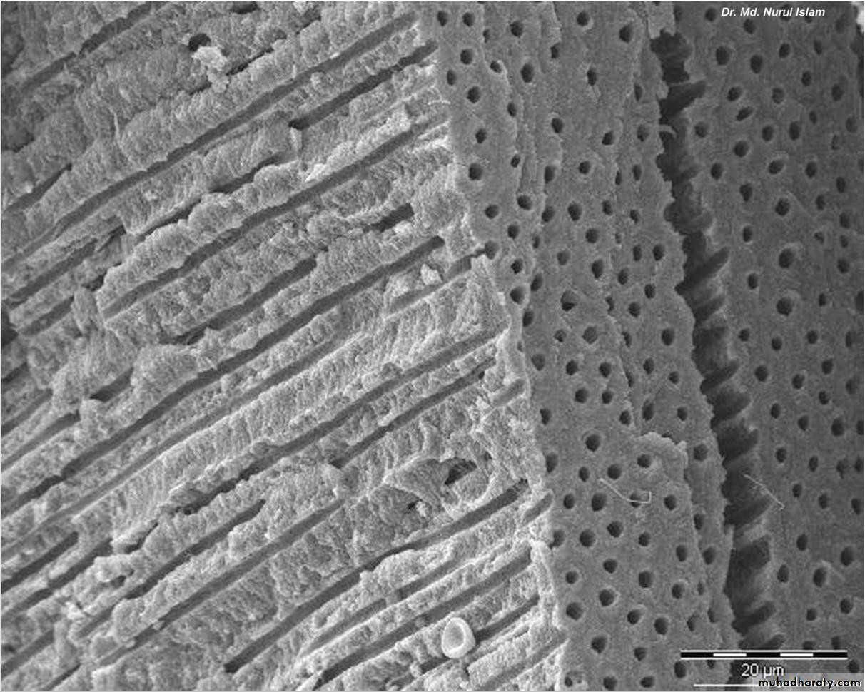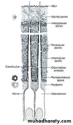 The number of tubules increases from DEJ to pulp. The lumen of the tubules also varies from the DEJ to the pulp surface. In coronal dentin, the average diameter of tubules increases from DEJ to pulp .