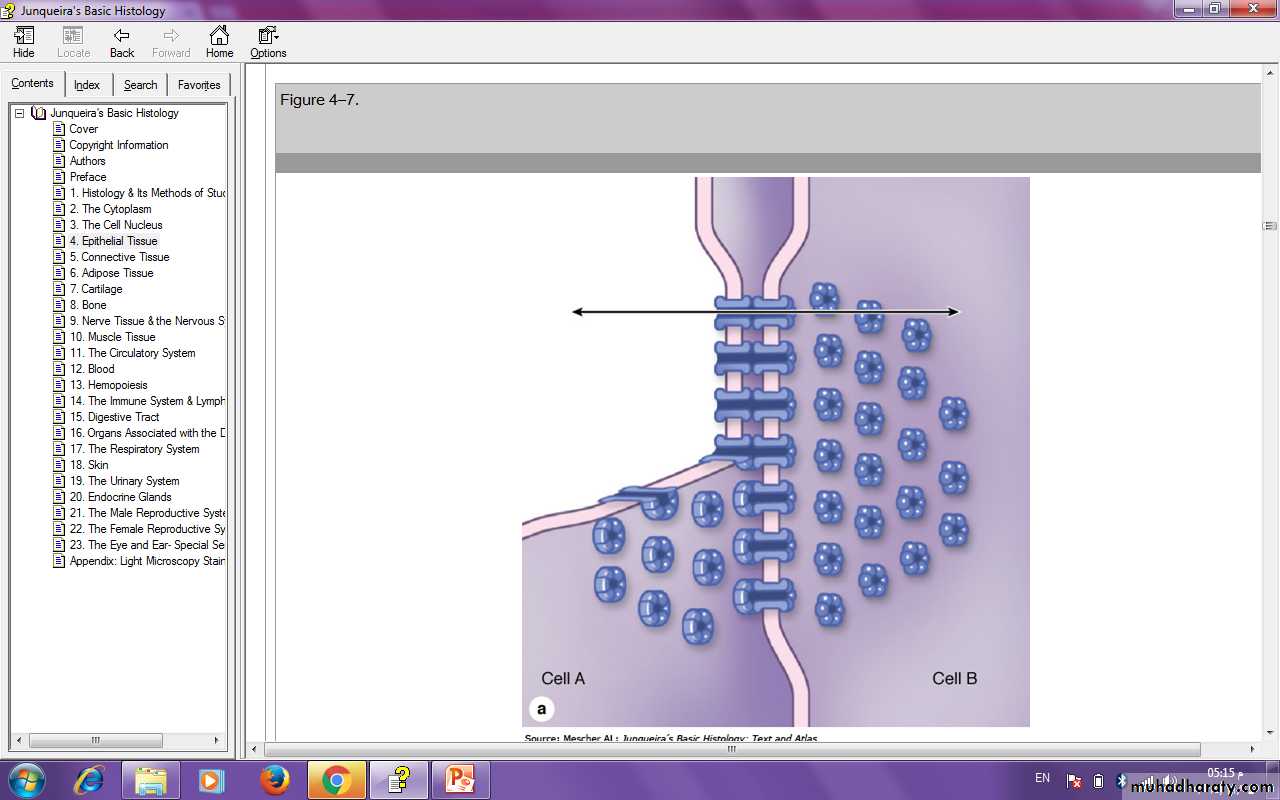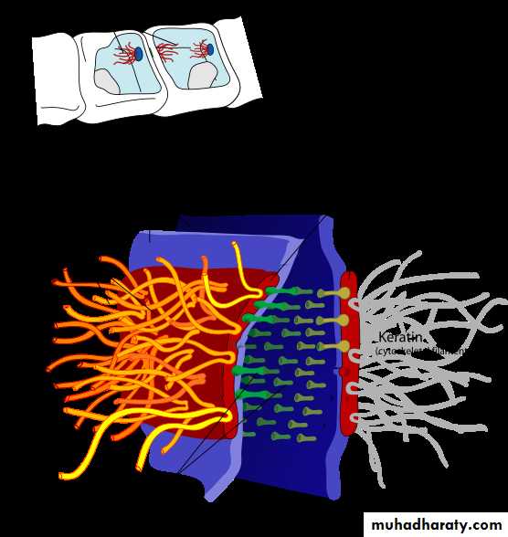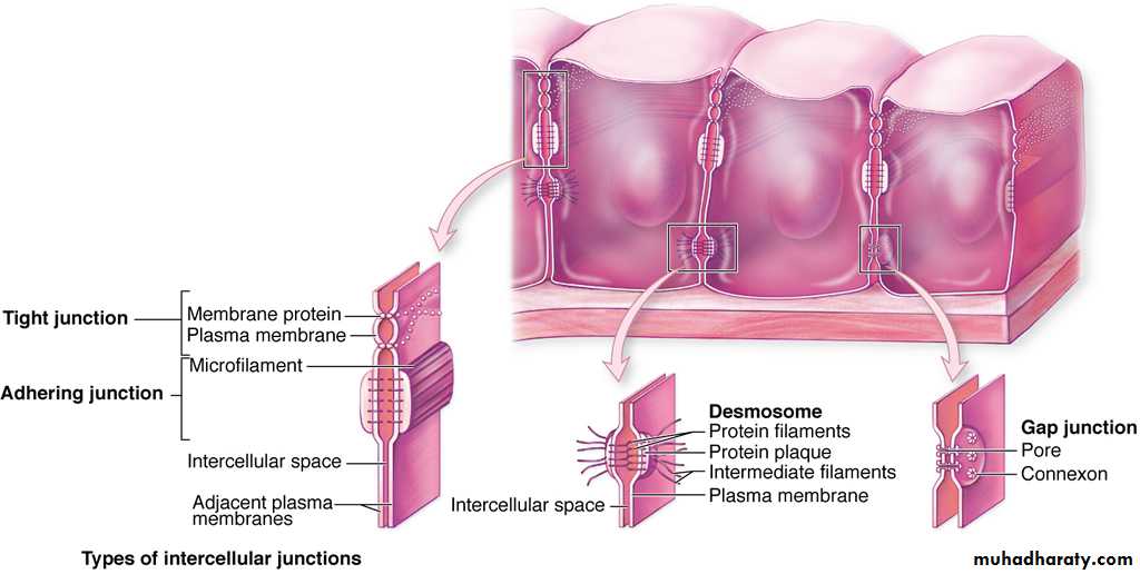 They attached to intermediate filaments made of a protein called keratin; they hold two adjacent cells tightly together of a localized region. Desmosomes do not prevent the movement of ions or molecules around cells but they are usually found in combination with tight junction which do. Usually desmosome found in tissues that undergoes a constant stretching and pressure (e.g. Skin and intestinal tissue).3- Gap junctions