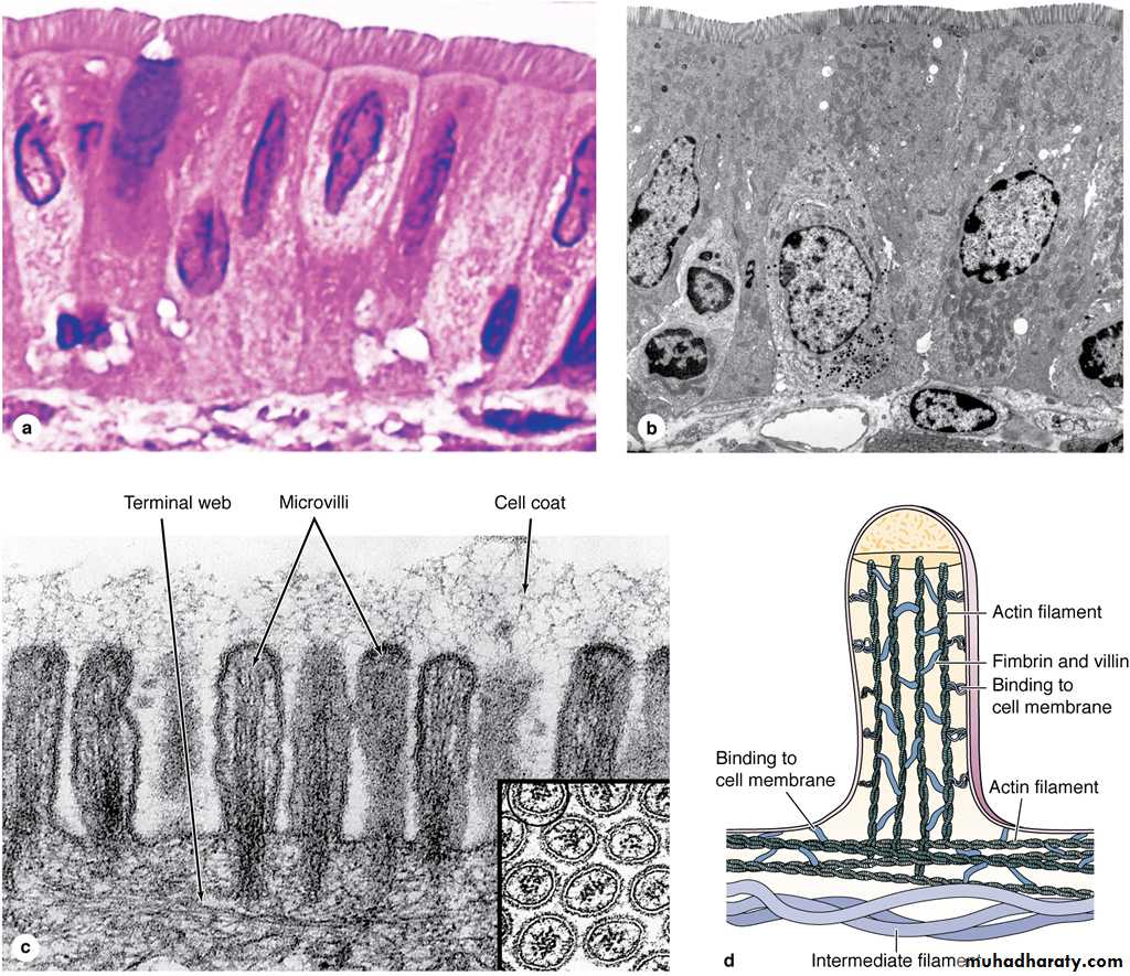 In absorptive cells, such as the lining epithelium of the small intestine, the apical surface presents orderly arrays of many hundreds of more permanent microvilli (L. villus, tuft).The average microvillus is only about 1 µm high and 0.08 µm wide, but with hundreds or thousands present on the end of each absorptive cell.