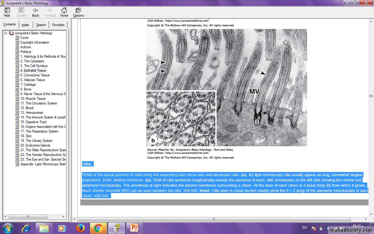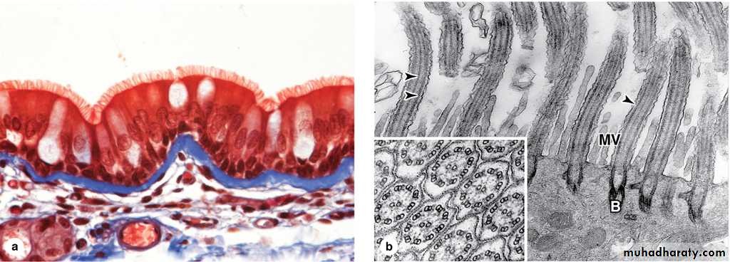 Cilia are elongated, highly motile structures on the surface of some epithelial cells, 5–10 µm long and 0.2 µm in diameter, which is much longer and two times wider than a typical microvillus.In living organisms, cilia exhibit rapid back-and-forth movements coordinated to propel a current of fluid and suspended matter in one direction over the ciliated epithelium.