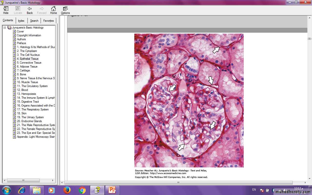 This section of kidney shows the typical basement membranes (arrows) of several tubules and of structures within the single glomerulus included here. In renal glomeruli the basement membrane, besides having a supporting function, has an important role as a filter. X100. Picrosirius-hematoxylin (PSH).Intercellular Adhesion & Other Junctions