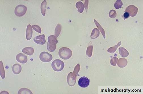 HBS polymerizes within the RBC and crystaline lead to red cell deformity in form of sickle shape.RBC has short life span and is trapped in the small vessels resulting in vaso-occlusion and so ischemia and infarction of organs or bones. This is induced and increase with hypoxia ,dehydration ,and cold. Clinical features depend upon the site and the severity of vaso-occlusive crises. Most pts. Have all his HB as HBS and only 1% of HBF. While some have high HBF as 10-15% and so they have milder symptoms. Peripheral blood smear shows sickle cells and increased reticulocyte count With low ESR .