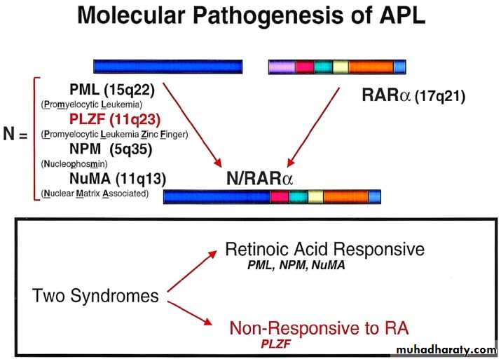 3 Acute Promyelocytic Leukemia (APML) 10-15%marrow cells hypergranular promeyelocytesAuer rods/ faggot cells may be seenClassical-Hypergranular, 80% leukopaenic Variant-Hypogranular, leukocytosisGranules contain procoagulants (thromboplastin-like) - massive DICt(15:17) is diagnosticFAB-AML-cont.
